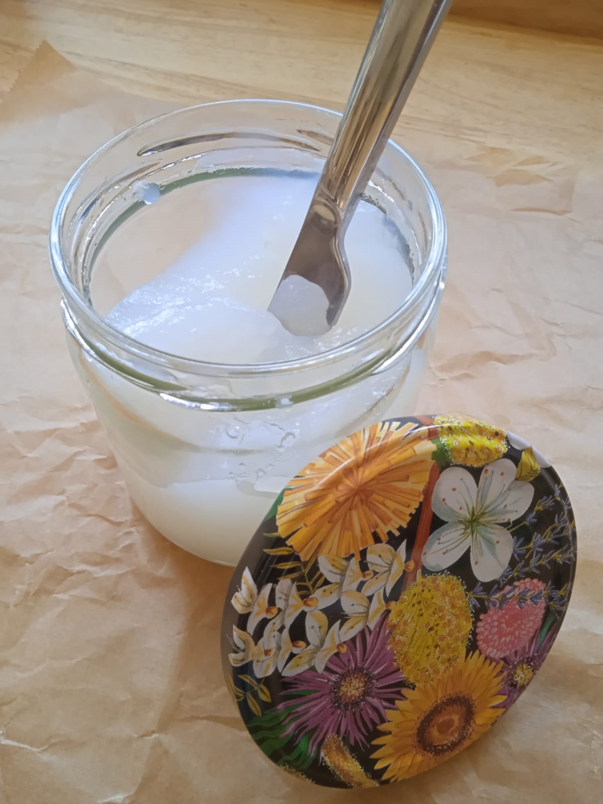 Jetzt das kochende Wasser zugießen. Sofort und zügig rühren. Es dickt sekundenschnell zu einem Glibber. Ist der noch zu fest, einfach noch etwas kaltes Wasser zufügen und wieder feste rühren. Der Stärkekleber sollte eine geleeartige Substanz letztendlich sein, die man noch gut in ein Schraubglas abfüllen kann. Alles abgefüllt, das Glas an die Seite stellen und abkühlen lassen. Vielleicht noch einen Hinweis für die Familie auf das Glas kleben, dass das kein Transparent-Nutella oder Zitronengelee ist. Also „Finger weg!“ Schmeckt eh nicht … aber ich brauch den Kleber ja auch nicht zum Schlecken.