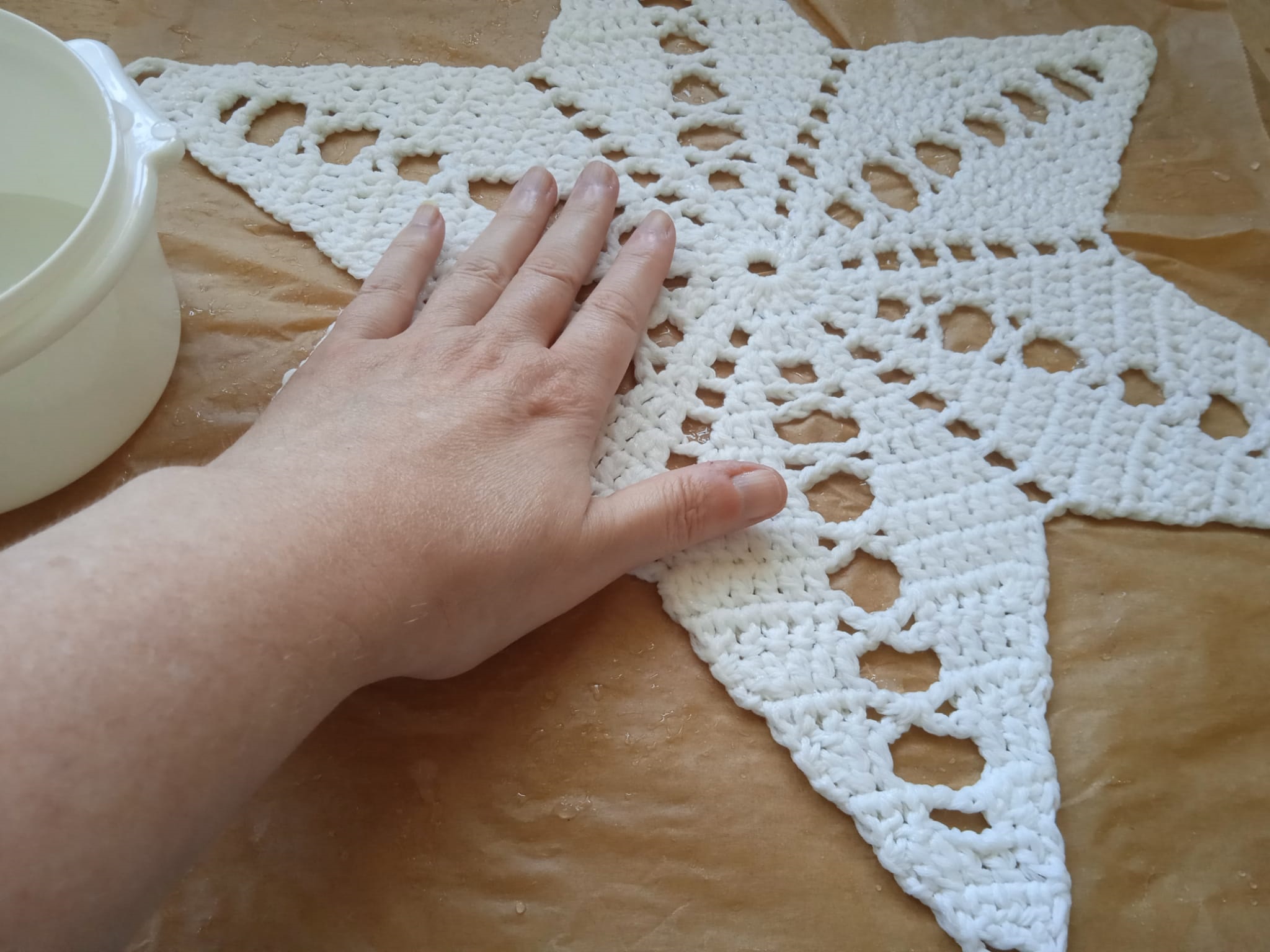 Keine Bange, der Stern wird nicht festkleben. Trotzdem öfters mal kontrollieren und etwas zupfen. In der Sonne geht die Trocknung recht fix. Ansonsten im Raum trocknen lassen.